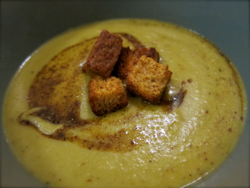 **To make whole wheat croutons, cube some bread. Toss the cubes with about 1 teaspoon of the curry brown butter and 1/2 teaspoon of olive oil. Salt and pepper then place into a 350 degree oven for about 10-15 minutes, until crisp and golden.