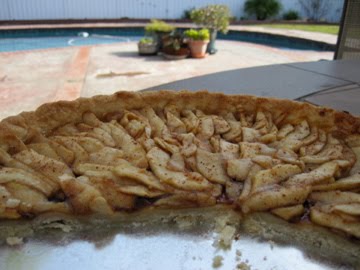 I brought my dough over to Linda’s house yesterday because I thought we might want something more to play with! We rolled out the dough and placed it in a tart shell. We spread the shell with a layer of wild plum jam and then we layered apples from her apple tree in concentric circles around the tart, but first we tossed the apples with a bit of sugar, lemon juice, and cinnamon. We made sure not to add too much sugar because we liked the balance of the sweet crust with a nice tart apple. To top it all off, we sprinkled some raw (turbinado or demerara) sugar over the tart. This gave the tart a nice little crunch of sweetness!