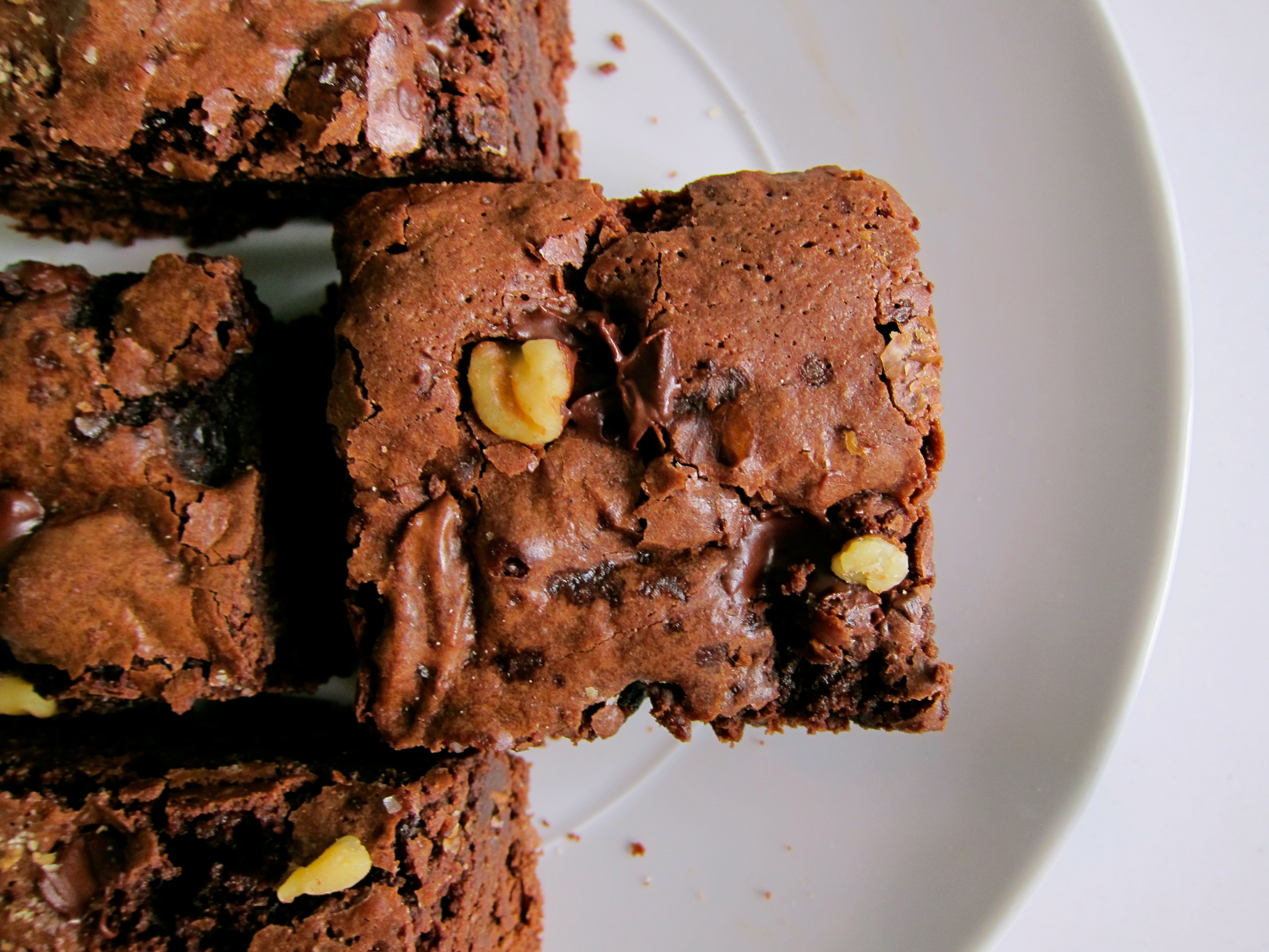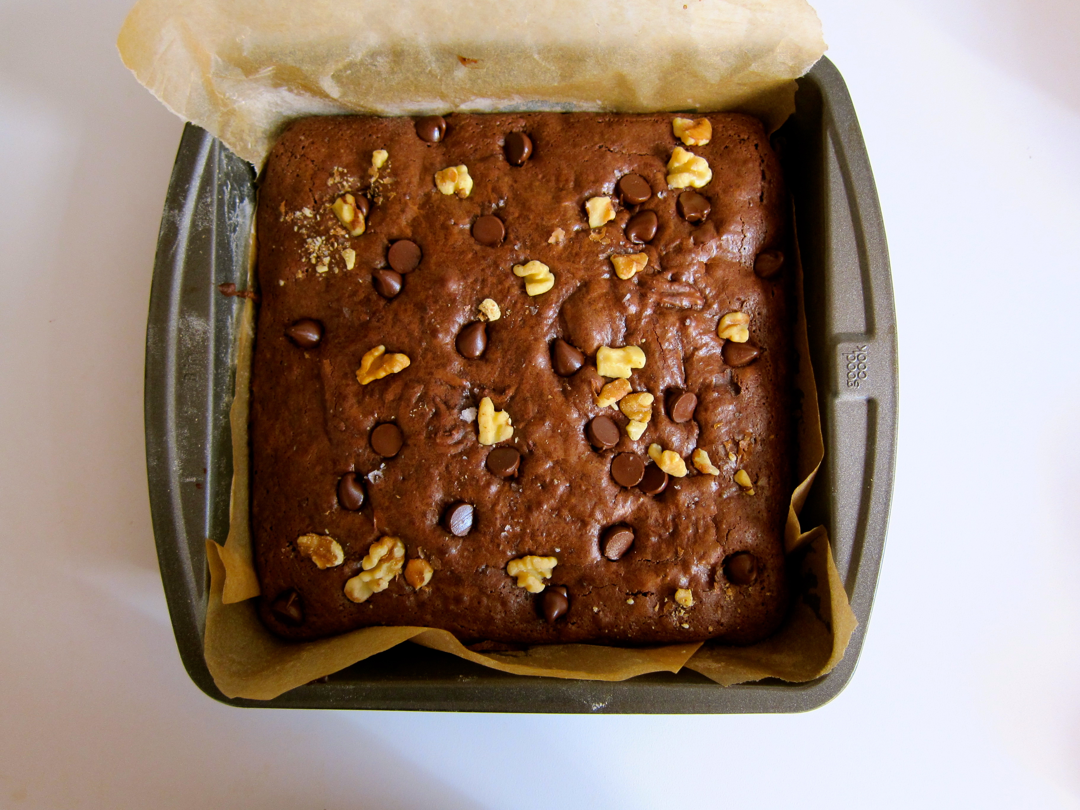 Bake the brownies for about 25-28 minutes. Note that brownies are better slightly underdone than overdone. Right? Right. Let the brownies cool on a wire rack for 10-20 minutes, then lift them out of the pan using the parchment overhang. Slice and enjoy.