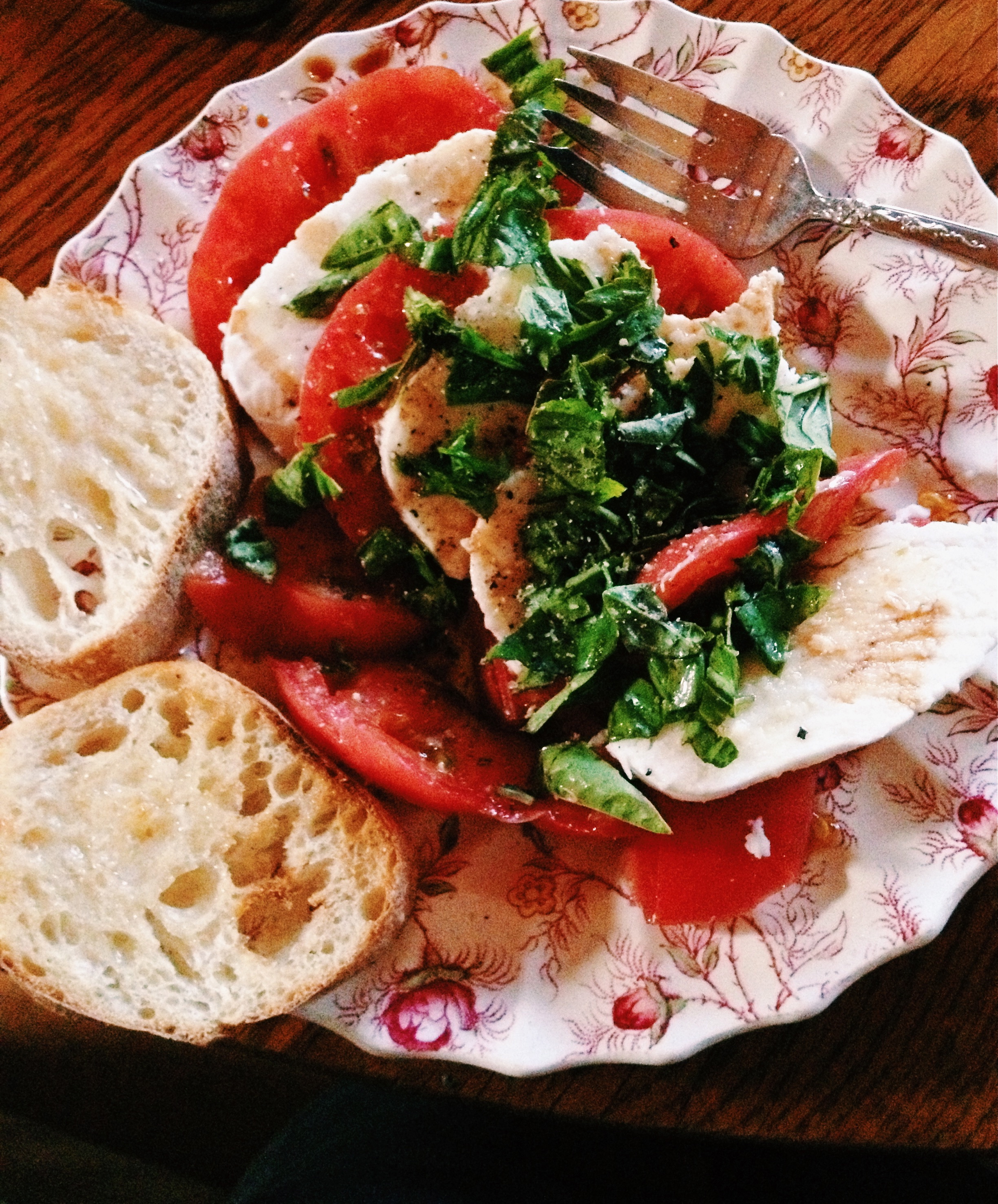 Food was growing everywhere I turned–there were sunflowers and grapevines, bushes of wild blackberries and strawberries, apple trees and pear trees, even some avocados and figs. But nothing screamed mid-August to me like the fresh basil from the yard, with plump, juicy tomatoes. Gosh, good tomatoes are SO good.