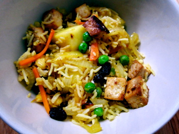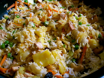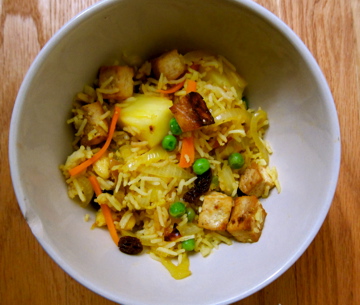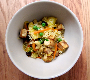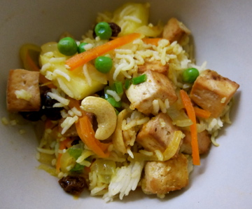 Tags: cashews, peas, pineapple, raisins, rice, tofu, vegan