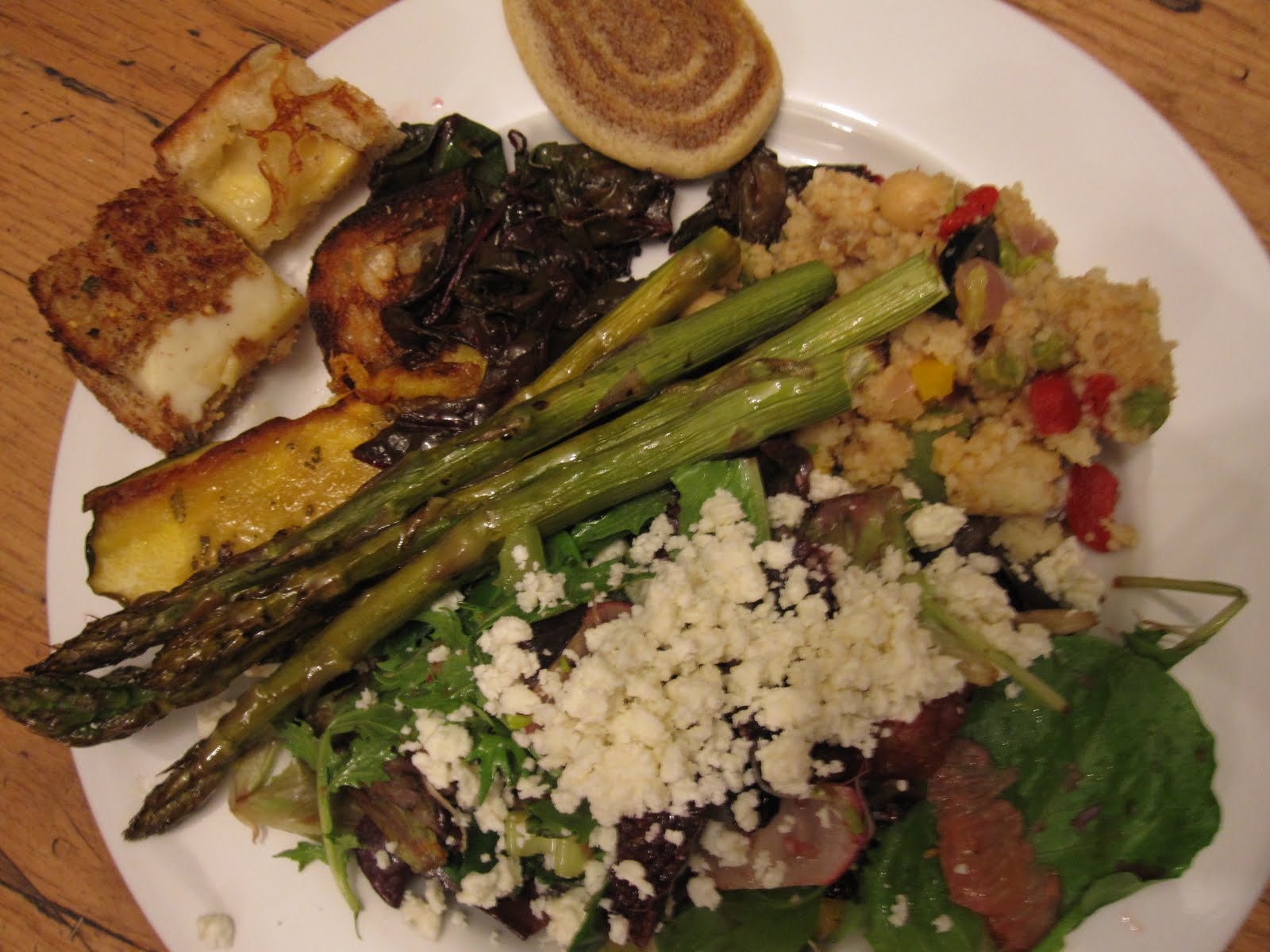 Mini grilled cheese bites (with a rosemary butter), balsamic roasted asparagus with sautéed chard, couscous salad with chickpeas, roasted bell peppers, olives, onion, and peas, and a spring mix salad with citrus (blood oranges, cara cara oranges, and grapefruit), cranberries, and feta cheese. Oh yes, and lemon ginger molasses pinwheel cookies as well as vegan sugar cookies for the vegans.
