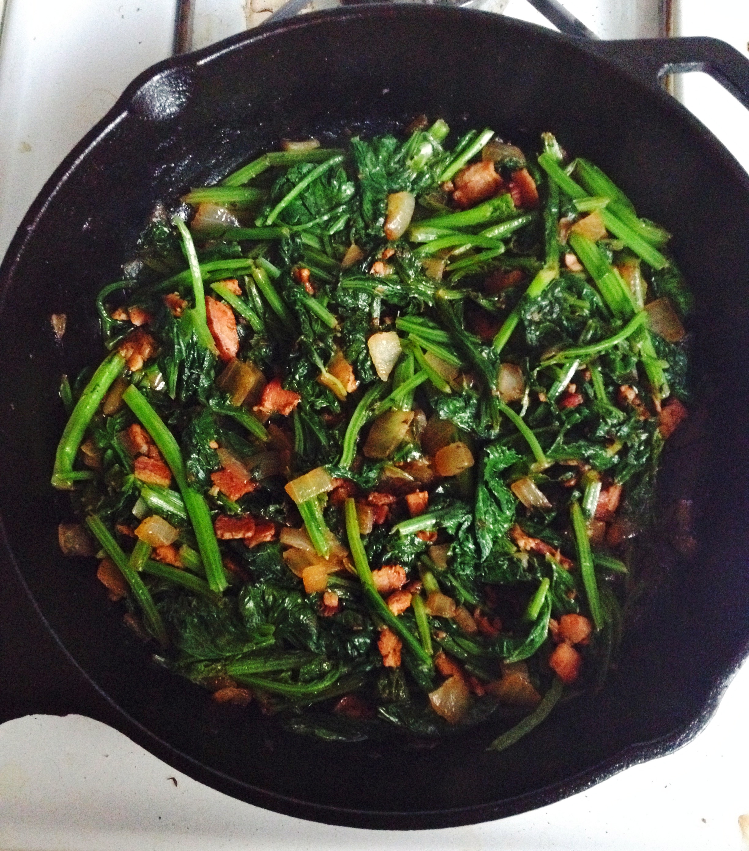 Bacon + mustard greens nudged with creamy yellow corn grits. Bitter-creamy-toothy-savory goodness. A real spring comfort.