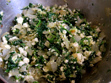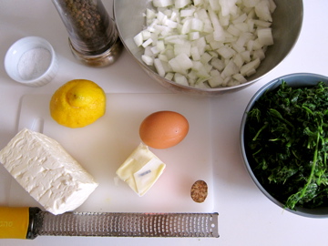 In a bowl, crumble the feta and add grated nutmeg, fresh pepper, lemon, and a tiny pinch of salt (remember, feta is already quite salty). Stir together. Add the spinach and onions and stir everything together. Taste and adjust seasonings. Stir in the egg until everything is mixed together.