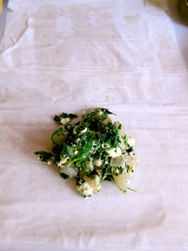 Filling gets placed on the bottom center of the rectangle of filo (2 sheets).