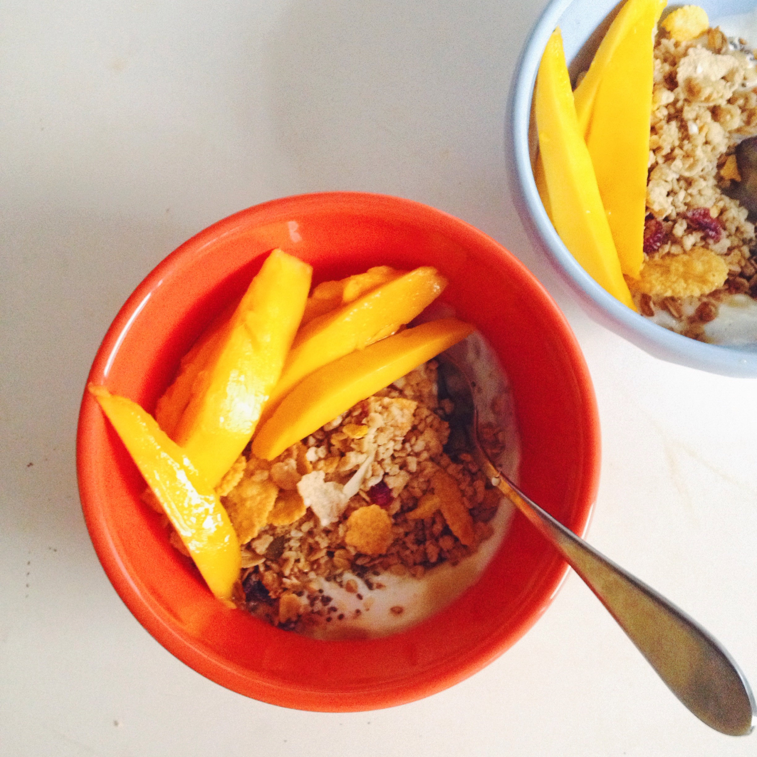Speaking of mango, here’s a classic bowl of plain yogurt with granola, chia seeds, and mango slices. As you can see, my brain is already on “warm, sunny weather” mode.