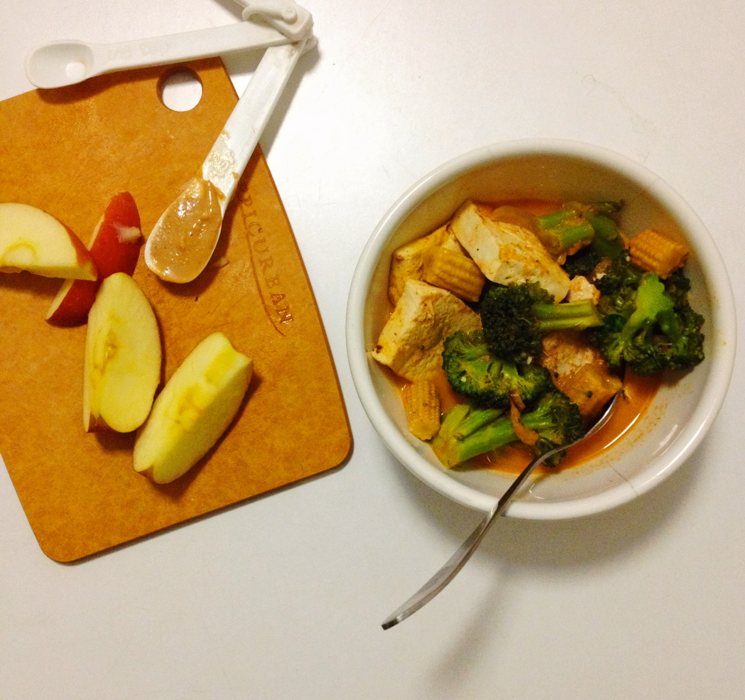 Whipped up a tofu vegetable curry for dinner one night. With a few apple slices and peanut butter on the side. This is a go-to meal for me, but I changed it up by using a little baby corn. Organic canned baby corn gets drained and rinsed and added to the curry with some fresh broccoli. A different vegetable than I would normally use, and I appreciate the change. Did you know you could “dry sauté” tofu? Slice the tofu and place it in a heated, dry non-stick skillet. The heat takes out all of the excess moisture, and still gives it a nice “crust” because the skillet is non-stick. Now the tofu is ready to soak up all of the yummy curry sauce (a similar effect to “pressing” tofu).
