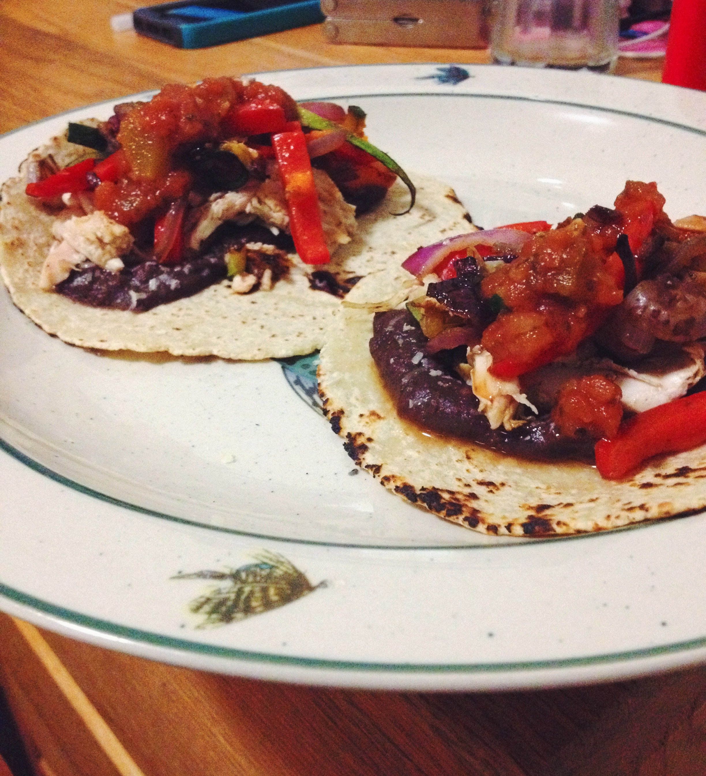 Taco night. Corn tortillas toasted on the gas stovetop flame. Smear with refried black beans. Top with leftover chicken, and some sautéed bell peppers and onions. A little salsa or hot sauce for acidity.