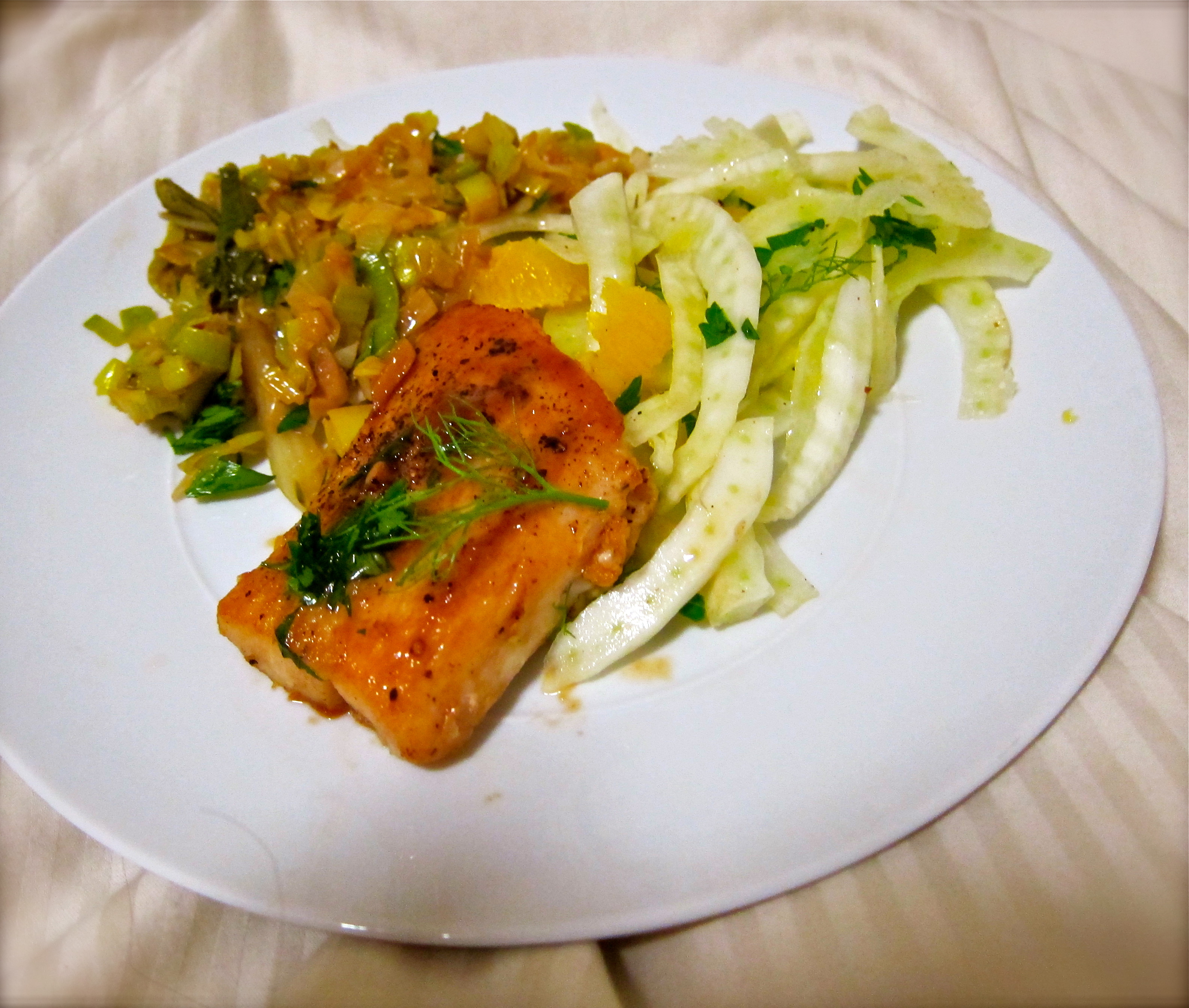 I ate the fish with some sautéed leeks and a quick fennel orange salad (literally fennel, orange slivers, and a touch of OJ + olive oil/salt/pepper).