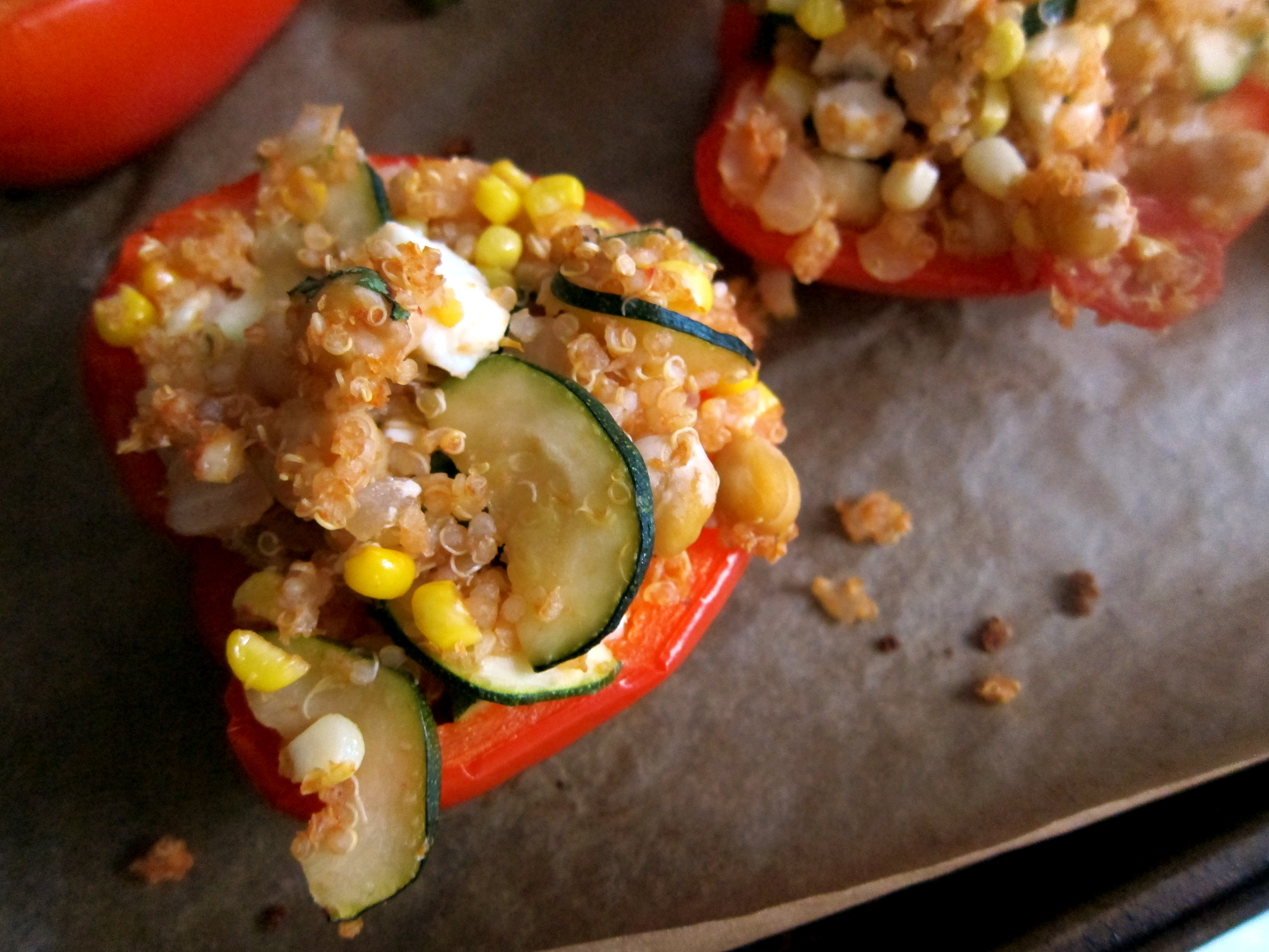 5. Fill the pepper halves with heaping amounts of the quinoa mixture. It is ok to have some leftover mixture for nibbling on later in the week. Bake the filled peppers for another 15 minutes. Enjoy!